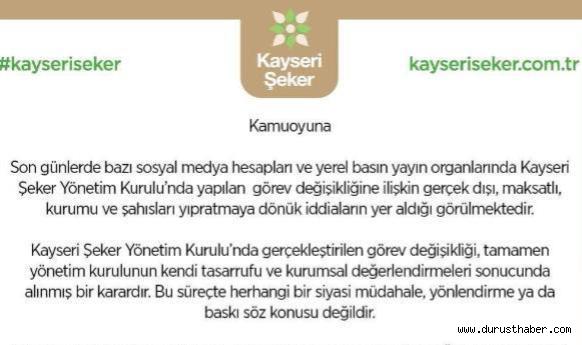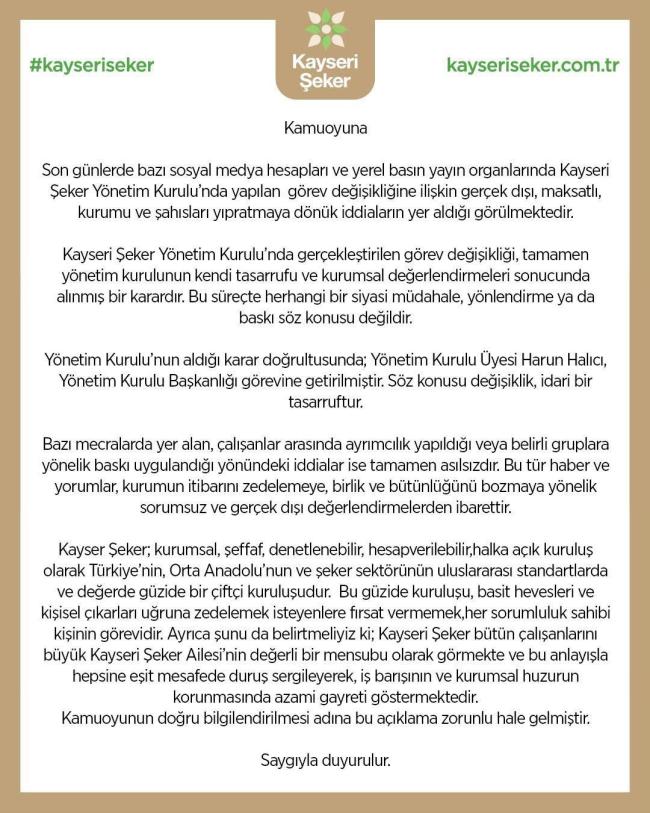 Kayseri Şeker’in kurumsal, şeffaf ve halka açık bir kuruluş olduğuna dikkat çekilen açıklamada, kurumun itibarını zedelemeye yönelik iddialara karşı tüm çalışanlarına eşit mesafede durulduğu ve iş barışının korunmasına azami özen gösterildiği kaydedildi.