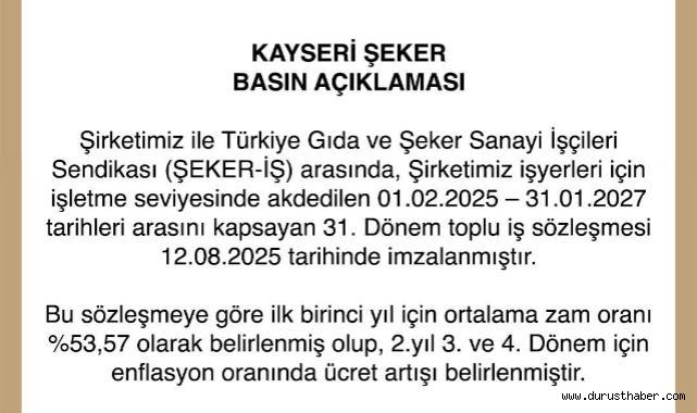 Kayseri Şeker Fabrikası ile Şeker-İş Sendikası arasında imzalanan 31. Dönem Toplu İş Sözleşmesi kapsamında işçilere yüzde 53 oranında rekor zam yapıldı. Açıklamayı kayseri Şeker Yönetim Kurulu Başkanı hüseyin akay duyurdu.