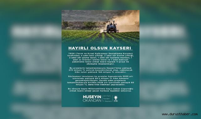 Tarım ve gıda sektöründe Kayseri’nin üretim kapasitesini artırması hedeflenen projelerin, istihdama ve kırsal kalkınmaya önemli katkı sağlaması bekleniyor. Sürece destek veren başta AK Parti Kayseri Milletvekili Şaban Çopuroğlu olmak üzere emeği geçenlere teşekkür edildi.