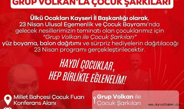 Ülkü Ocakları Kayseri İl Başkanlığı, 23 Nisan Ulusal Egemenlik ve Çocuk Bayramı dolayısıyla çocuklara özel renkli bir etkinlik düzenlemeye hazırlanıyor. “Geleceğimizin teminatı çocuklarımız” vurgusuyla gerçekleştirilecek programda, Grup Volkan sahne alarak çocuk şarkıları seslendirecek.