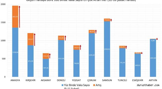 Sosyal medya hesabındaki açıklamasında Koca; “ 12-18 Şubat arasında vaka yoğunluğu bir önceki haftaya göre en çok artan 10 ilimiz: Amasya, Kırşehir, Aksaray, Denizli, Yozgat, Çorum, Samsun, Tunceli, Eskişehir, Artvin.” ifadelerine yer verdi.