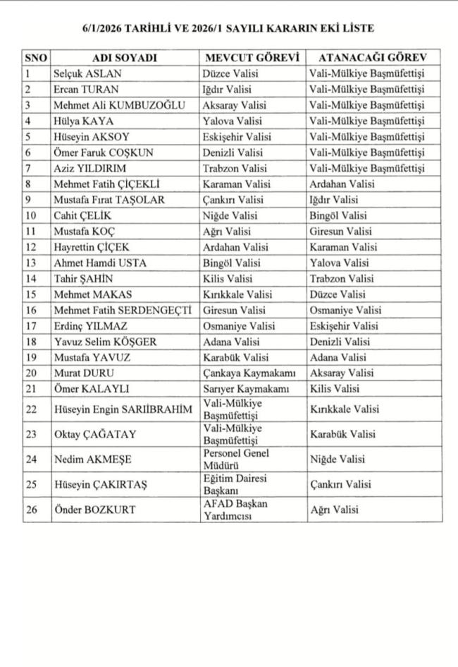 Günlerdir beklenen Valiler Kararnamesi resmi gazetede yayımlandı. Kararnamede 7 ilin valisi merkeze alınırken, 19 ilin valisi değişti. Kararnamenin açıklanması ile Kayseri Valisi Gökmen Çiçek görevine devam edecek. Buse Yıldız