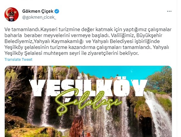Konuyla ilgili açıklama yapan Kayseri Valisi Gökmen Çiçek, "Ve tamamlandı. Kayseri turizmine değer katmak için yaptığımız çalışmalar baharla beraber meyvelerini vermeye başladı. Valiliğimiz, Büyükşehir Belediyemiz, Yahyalı Kaymakamlığı ve Yahyalı Belediyesi işbirliğinde Yeşilköy Şelaleleri’nin turizme kazandırma çalışmaları tamamlandı. Yahyalı Yeşilköy Şelaleleri muhteşem seyri ile ziyaretçilerini bekliyor" ifadelerini kullandı.