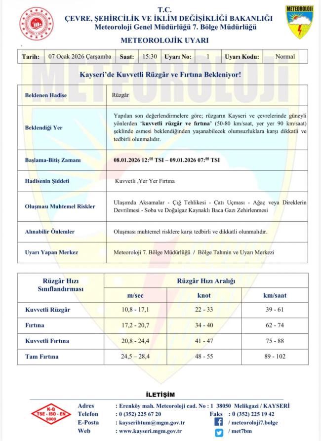 Meteoroloji Genel Müdürlüğü 7. Bölge Müdürlüğü, Kayseri ve çevresinde etkili olması beklenen kuvvetli rüzgar ve fırtınaya karşı vatandaşları uyardı. Yapılan son tahminlere göre, bölge genelinde güney yönlerinden esecek rüzgarın zaman zaman şiddetini artıracağı öngörülüyor.
