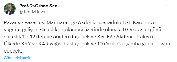 Ünlü Meteoroloji Uzmanı Prof. Dr. Orhan Şen sosyal medya hesabı üzerinden yaptığı paylaşımda İç Anadolu ve Batı Karadeniz’e uyarıda bulundu. Şen tarih vererek sıcaklığın 10 derece birden düşeceğini söyledi.Şen konuyla ilgili yaptığı paylaşımda ''Pazar ve Pazartesi Marmara Ege Akdeniz İç anadolu Batı Kardenize yağmur geliyor. Sıcaklık ortalaması üzerinde olacak. 9 Ocak Salı günü sıcaklık 10-12 derece aniden düşecek ve Kıyı Ege Akdeniz Trakya ile Ülkede KKY ve KAR yağışı başlayacak ve 10 Ocak Çarşamba günü devam edecek.'' ifadelerine yer verdi.