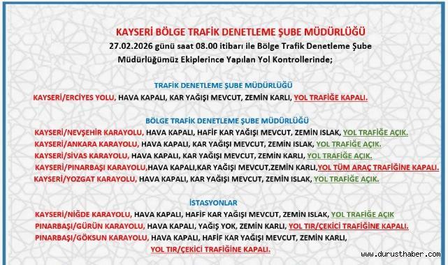 Kayseri Bölge Trafik Denetleme Şube Müdürlüğü, 27 Şubat 2026 saat 08.00 itibarıyla il ve ilçelerdeki yol durumunu açıkladı. Ekipler, tepe lambaları açık şekilde denetimlerini sürdürüyor.Trafiğe Kapalı Yollar:Kayseri/Erciyes Yolu: Hava kapalı, kar yağışı mevcut, zemin karlı, yol trafiğe kapalı.Kayseri/Pınarbaşı Karayolu: Hava kapalı, kar yağışı mevcut, zemin karlı, tüm araç trafiğine kapalı. Trafiğe Açık Yollar:Kayseri/Nevşehir Karayolu: Hafif kar yağışı mevcut, zemin ıslak, yol trafiğe açık.Kayseri/Ankara Karayolu: Kar yağışı mevcut, zemin ıslak, yol trafiğe açık.Kayseri/Sivas Karayolu: Kar yağışı mevcut, zemin karlı, yol trafiğe açık.Kayseri/Yozgat Karayolu: Kar yağışı mevcut, zemin ıslak, yol trafiğe açık.Kayseri/Niğde Karayolu: Hafif kar yağışı mevcut, zemin ıslak, yol trafiğe açık. Tır ve Çekici Trafiğine Kapalı Yollar:Pınarbaşı/Gürün Karayolu: Zemin karlı, tır ve çekici trafiğine kapalı.Pınarbaşı/Göksun Karayolu: Hafif kar yağışı ve karlı zemin, tır ve çekici trafiğine kapalı. Kaynak: Haber MerkeziSeda Kantekin