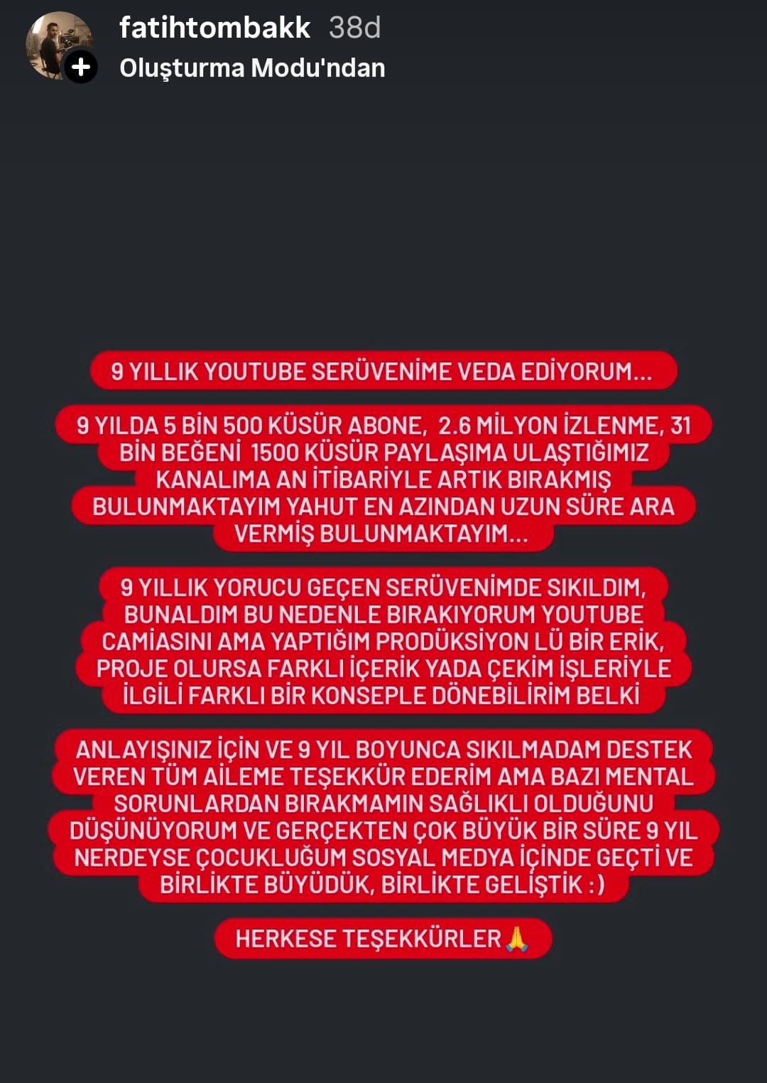Genç içerik üreticisi Fatih Tombak, 9 yıldır aktif olarak sürdürdüğü YouTube kariyerini bıraktığını açıkladı. Tombak, bu kararı Instagram hesabı üzerinden yaptığı duygusal bir paylaşımla takipçilerine duyurdu.
