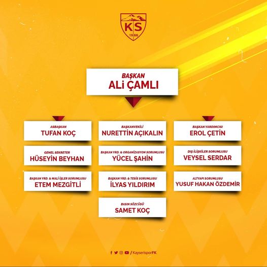 Sarı-kırmızılı takımın sosyal medya hesabından yapılan paylaşıma göre, Kayserispor'da yeni yönetim kurulunda görev dağılımı şöyle oluştu:Başkan: Ali ÇamlıAsbaşkan: Tufan KoçBaşkan Vekili: Nurettin AçıkalınBaşkan Yardımcısı: Erol ÇetinGenel Sekreter: Hüseyin BeyhanBaşkan Yardımcısı ve Organizasyon Sorumlusu: Yücel ŞahinDış İlişkiler Sorumlusu: Veysel SerdarBaşkan Yardımcısı ve Mali İşler Sorumlusu: Etem MezgitliBaşkan Yardımcısı ve Tesis Sorumlusu: İlyas YıldırımAltyapı Sorumlusu: Yusuf Hakan ÖzdemirBasın Sözcüsü: Samet Koç