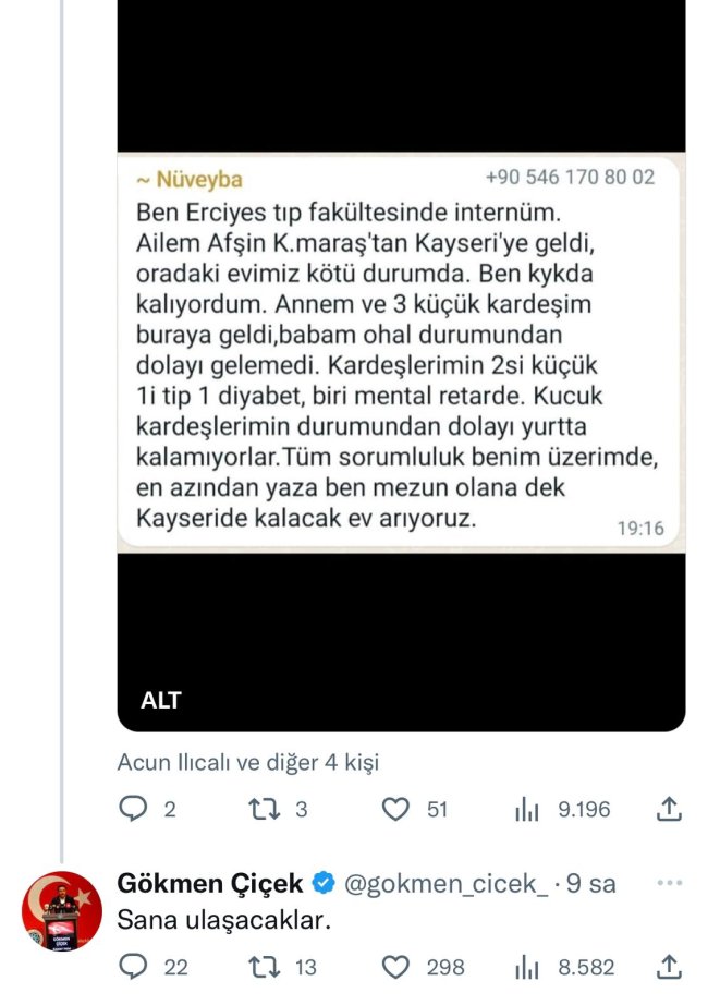 Vali Çiçek, sosyal medya üzerinden Erciyes Tıp Fakültesi’nde staj yapan bir öğrencinin ‘Kayseri’de ailemle birlikte kalacak yer arıyorum’ çağrısına cevap verdi.