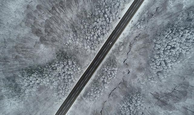 Kar örtüsü altındaki ormanlar dronla görüntülendi.