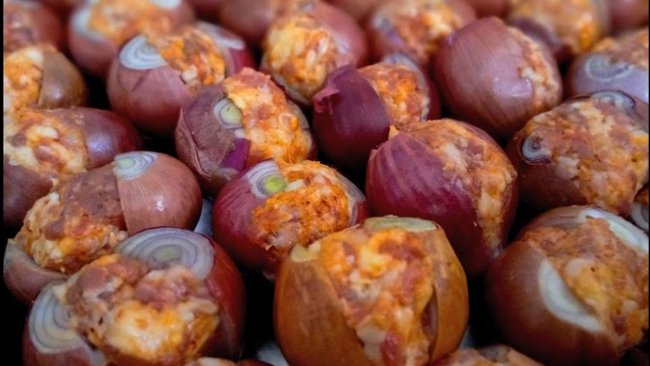 Tarifimize öncelikle soğanlarımızı soymakla başlıyoruz. Kuru soğanlarımızın sadece dış kabuklarını soyuyoruz. Son kattaki kabuğu soymuyoruz. Soğanlarımızı ortadan ikiye tamamen ayrılmayacak şekilde keselim.