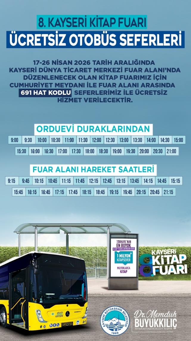 Kayseri’de 17-26 Nisan’da düzenlenecek 8. Kitap Fuarı için ücretsiz ulaşım sağlanacak. 691 numaralı hat, fuar süresince hizmet verecek.