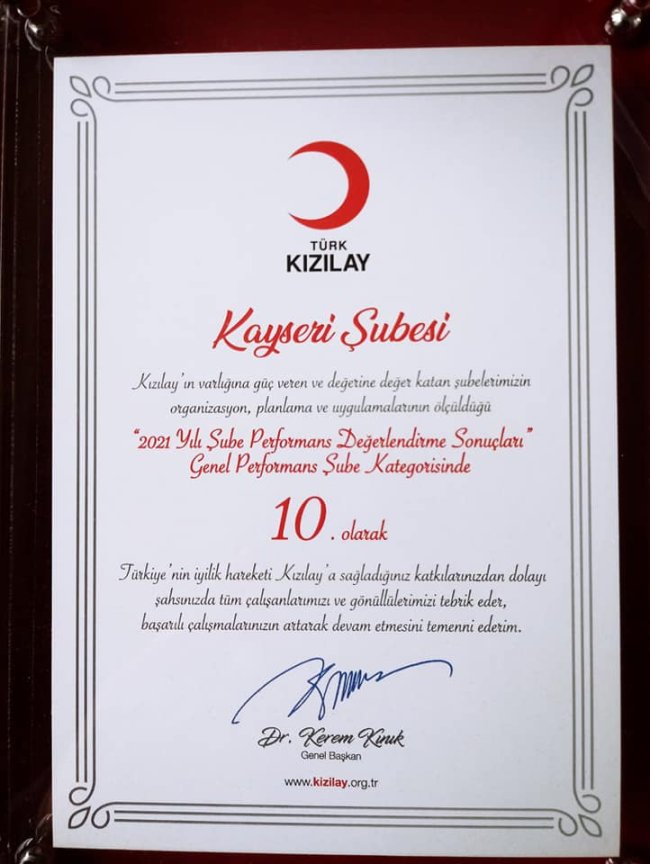 Türk Kızılay Kayseri şubesi 2021 yılı şube performans değerlendirmeleri sonucunda ülke genelinde 10. sırada yer aldı.
