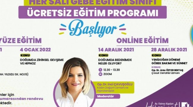 Kadın Doğum Uzmanı ve Hipnoterapist Op. Dr. İnci Çavuşoğlu tarafından verilecek olan eğitimlerle anne adaylarına doğum öncesi, doğum ve doğum sonrası dönemlerine ilişkin bilgiler verilecek. Anne adayları, 3 hafta boyunca yüz yüze ve online olarak verilecek eğitimlere katılmak için 0262 318 02 10 numaralı telefonu arayarak randevu alabilecek.