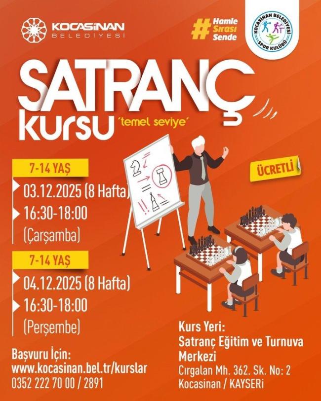 Kocasinan Belediyesi, 7-14 yaş grubundaki çocuklara yönelik temel seviye satranç kursu düzenliyor. Sekiz hafta sürecek kurs, çocukların satranç becerilerini geliştirmesine katkı sağlayacak.