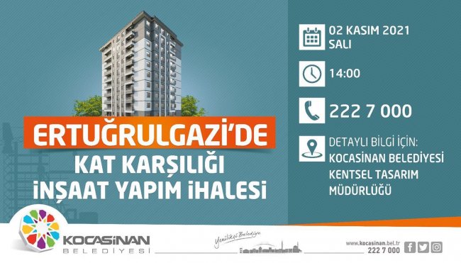 Başkan Çolakbayrakdar, sözlerini “Vatandaşlarımızın yaşamaktan keyif alacağı ve mutluluk duyabileceği bir Kocasinan inşa etmeye devam edeceğiz” diyerek noktaladı.Öte yandan 2 Kasım 2021 Salı günü saat 14.00'de gerçekleştirilecek olan kat karşılığı ihalenin şartname ve eklerinin Kentsel Tasarım Müdürlüğü'nden temin edinilebileceği gibi 0(352) 222 70 00 numaralı telefondan da ayrıntılı bilgi alınabileceği kaydedildi.