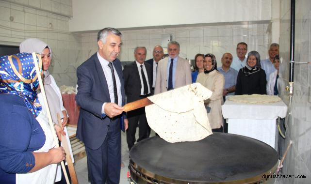Kaymakam Abay, Sosyal Yardımlaşma ve Dayanışma Vakfı Mütevelli Heyeti üyeleriyle birlikte ziyaret ettiği kooperatifte, kadınlarla birlikte saç ocaklarında yufka pişirdi.
