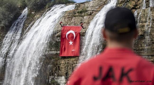 Zorlu arazi şartlarında yaptıkları başarılı terör operasyonlarına hazırlanır gibi tam teçhizatlı komandolar, ilk olarak UNESCO Dünya Mirası listesine aday gösterilen ve 21 metre genişlik, 48 metre yüksekliğe sahip Tortum Şelalesi'ne Türk bayrağı astı. Kayalıklardan aşağı halatlarla inen JAK timleri, şelalenin orta kısmına gelince Türk bayrağını açarak havada asılı vaziyette selam durdu.54 metrekarelik bayrakla dalış yaptılar