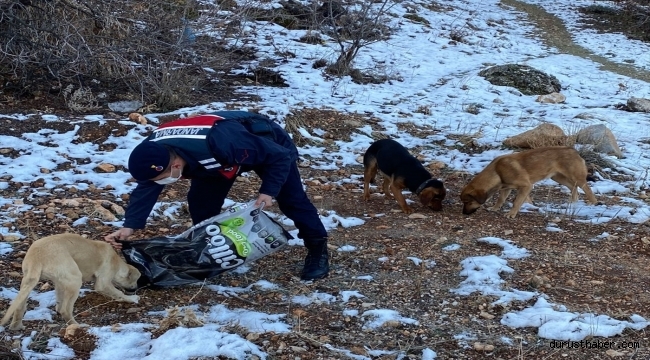 Konya'da kar yağışının etkili olduğu bölgelerde yiyecek bulmakta zorlanan sokak hayvanlarına, jandarma ekiplerince yiyecek dağıtıldı.