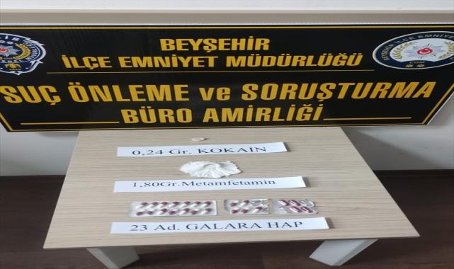 İl Emniyet Müdürlüğü Kaçakçılık ve Organize Suçlarla Mücadele (KOM) Şubesi ile Beyşehir İlçe Emniyet Müdürlüğü Suç Önleme ve Soruşturma Büro Amirliği ekipleri 42 AHS 465 plakalı araç Beyşehir ilçesi girişinde durduruldu.Araçta 23 sentetik uyuşturucu hap, 0,24 gram kokain, 1,80 gram sentetik uyuşturucu ele geçirildi.Gözaltına alınan araçtaki şüphelilerden V.K'nin 19, C.K'nin ise 24 suçtan kaydı olduğu ortaya çıktı.Şüpheliler emniyetteki işlemlerin tamamlanmasının ardından adliyeye sevk edilecek.