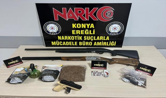 Konya'nın Ereğli ilçesinde, uyuşturucu ticareti yaptıkları ileri sürülen 2 zanlı tutuklandı. İlçe Emniyet Müdürlüğü Narkotik Suçlarla Mücadele Büro Amirliği ekipleri, Emin D. ile Hacı S'nin uyuşturucu ticareti yaptığı ihbarını aldı.Şüphelilerin kaldığı evlere düzenlenen eş zamanlı operasyonda yapılan aramalarda, 385 gram sentetik kannabinoid, bir miktar metamfetamin ve uyuşturucu hap, 2 ruhsatsız av tüfeği ve ruhsatsız tabanca ele geçirildi.Operasyonda gözaltına alınan 2 zanlı, emniyetteki işlemlerinin ardından sevk edildikleri sulh ceza hakimliğince tutuklandı.