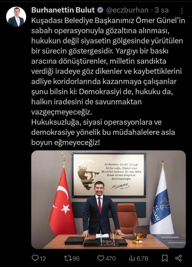 CHP Genel Başkan Yardımcısı Burhanettin Bulut, sosyal medya hesabından yaptığı açıklamada operasyonu “hukukun değil siyasetin gölgesinde yürütülen bir süreç” olarak nitelendirerek, demokrasi ve halkın iradesini savunmaktan vazgeçmeyeceklerini ifade etti.