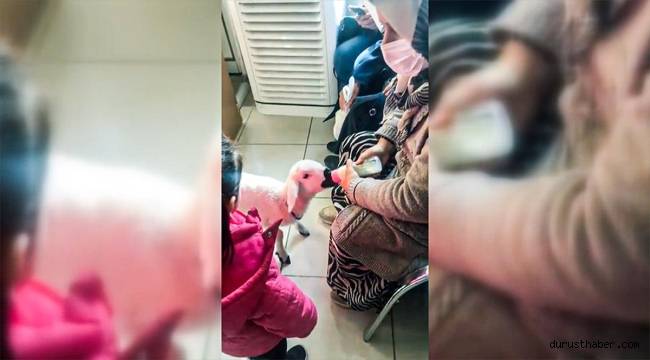 Annesini hastaneye getiren kadın, evde tek başına bırakamadığı kuzusunu da yanına aldı. Kadın, kuzuyu biberonla besledi.