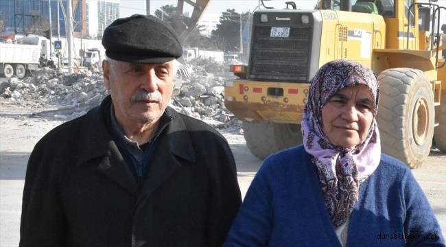 Sağlık kontrollerinin ardından yakınlarının yanına yerleşen çiftin 5 çocuğundan ikisinin evi ağır hasarlı, aynı sitede farklı blokta oturan oğlu Ömer Dolgan'ın da evi yıkıldı.Yaşlı çift, oğulları Ömer Dolgan ile Akçadağ ilçesinden her gün gelerek evlerinin enkazının kaldırma çalışmalarını takip ediyor.Komşularını da kaybeden aile, yaklaşık 25 yıl anı biriktirdikleri evlerinin enkazından çıkan eşyalarını alıyor.Halil Dolgan, AA muhabirine, ilk depremde yattığı sırada avizenin sallandığını ve hemen kalkarak kapı pervazının bulunduğu noktaya gittiğini söyledi.Sallanma esnasında tarif edilemeyecek şiddette bir ses geldiğini anlatan Dolgan, "O zaman demek ki bina yıkılmış. Kapı da göğsümde yaslı şekilde beni yatak odasından salona getirmiş ama o kapı beni kurtarmış. Hiçbir yerime bir şey değmedi. Çocuklar dışarıdan telefonla aradı. Telefon da elimin altında. Telefonlara cevap verdim. Onlar dışarıda bağırıyor, 'Baba, ana...' diyorlar. Seslerini duyuyoruz ama bir şey yapamıyoruz." dedi.Dolgan, salonun köşesindeki bir noktadan içeriye doğru ışık verildiğini belirterek, sözlerini şöyle sürdürdü:"Tuğlaların arasından ışık göründü. Birisi bağırdı, 'Işığı görüyor musun?' dedi. Ben de 'Görüyorum.' dedim. O zaman orayı, dış duvarı yıktılar. Bir vatandaş geldi bizi çıkarttı. Üzerimdeki kapıyı yukarıya doğru oynattı, ben aradan çıktım. Beni çıkarttı, ondan sonra da hanımı getirdi. Allah'a şükür bizde bir şey yok ama komşularımız gitti. Çıktıktan sonra bizi hastaneye götürdüler. Doktorlar baktılar, 'Bir şeyiniz yok.' dediler. Buna şükürler olsun."Enkazın başında beklediklerini dile getiren Dolgan, "En azından enkaz kalksın da gözümüzün önünden gitsin diye... Çok da büyük beklediğimiz bir şey yok. Burada izlerken hep ölen komşularımı gözümün önüne getiriyorum. Aynı katta olan komşularım, üstteki, alttaki komşularım öldü. Birinci katta aynı aileden 6 kişi öldü. Burada otururken onları hatırlıyorum. Bir zamanlar onlarla konuşuyorduk." diye konuştu."Bir şey olacağı akşam içime doğdu"