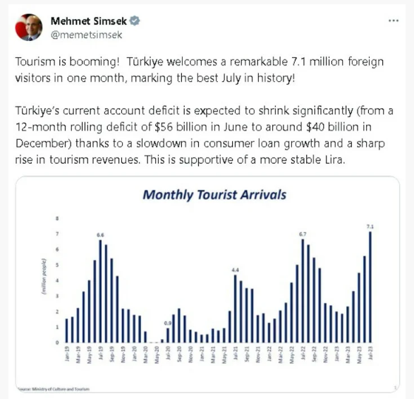 Hazine ve Maliye Bakanı Mehmet Şimşek, X sosyal medya platformundan yaptığı açıklamada, turizmde patlama yaşandığına dikkati çekerek şu ifadelere yer verdi:Bir ayda 7,1 milyon ile dikkate değer sayıda yabancı ziyaretçiyi ağırlayarak tarihin en iyi temmuz ayına damga vurdu. Türkiye'nin cari açığının tüketici kredilerinin büyümesindeki yavaşlama ve turizm gelirlerindeki keskin artış sayesinde (hazirandaki 56 milyar dolarlık 12 aylık bütçe açığından aralıkta 40 milyar dolar civarına) önemli ölçüde daralması bekleniyor. Bu da daha istikrarlı bir lirayı destekliyor.