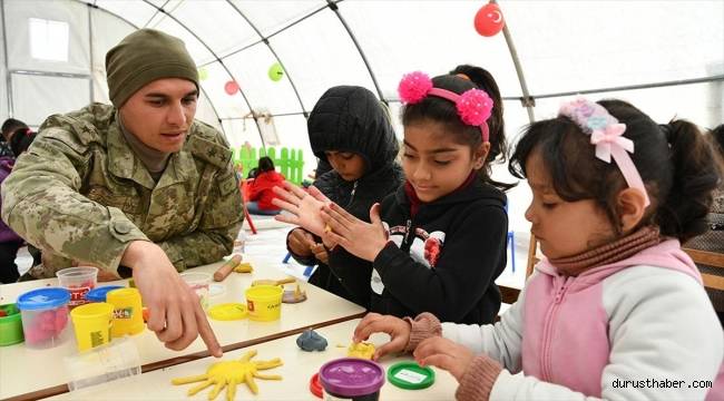 Mehmetçiğin kurduğu çadırlarda çocuklar etkinliklerle depremin etkisinden uzaklaşıyor