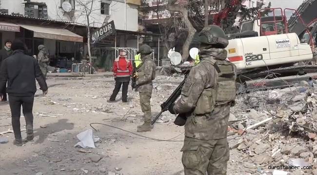 Bakanlığın paylaştığı görüntülerde, Mehmetçiğin, Kahramanmaraş'ın cadde ve sokaklarında, enkaz çalışmalarının olduğu bölgede ve yıkılan binaların civarında, emniyetin sağlanması için faaliyetlerde bulunduğu görülüyor.