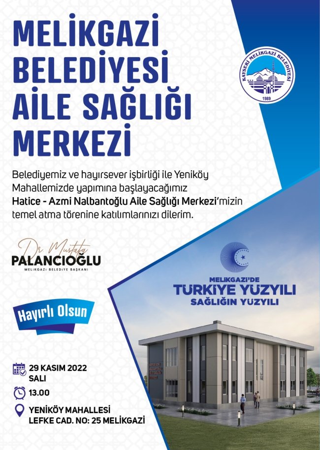 29 Kasım Salı günü saat 13.00'te yapılacak temel atma törenine tüm Kayserilileri davet eden Melikgazi Belediye Başkanı Dr. Mustafa Palancıoğlu, "Melikgazi'de sağlık alanında yaptığımız yatırımlarla ilçemizi önemli bir mesafeye ulaştırdı. Yeniköy Mahallesi'nde 650 metrekare alanda yapacağımız aile sağlığı merkezimiz zemin ve 1. kattan oluşuyor. Sağlık merkezi 4 hekimli kapasiteye sahip olup içerisinde muayenehaneler, tıbbi müdahale odası, aşı odası ve bebek izlem, gebe takip odası, seminer-eğitim odası, laboratuvarlar ve çocuk oyun alanı yer alıyor. Sağlık hizmetlerinin ilk aşaması ise aile sağlığı merkezleridir. Bu merkezlerimiz ne kadar güzel mekanlara sahip olursa o kadar güzel hizmet verirler. Sağlık olmazsa olmazımızdır. Her şeyin temeli sağlık. İnşallah yeni yapacağımız sağlık merkezimizin değerli hizmetler vermesini diliyorum. Mahallenin ihtiyacına cevap verecek olan yeni sağlık merkezimizin ilçemize ve mahalle sakinlerine hayırlı olmasını dilerim.” dedi.