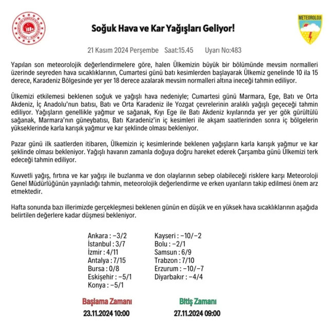 Meteoroloji Genel Müdürlüğü'nün hafta sonu için yaptığı uyarıların ardından yurt genelinde beklenen yağmur etkisini gösterdi..Çoğu ilde trafikte aksamalar, su baskınları ve eğitime ara verilmesine neden olan yağışlar sürerken, Meteoroloji'den yeni bir uyarı geldi.Yurt genelinde mevsim normalleri üzerinde seyreden hava sıcaklıklarının, cumartesi günü akşam saatlerinden itibaren 14-18 derece azalarak mevsim normalleri altına ineceğinin tahmin edildiği belirtildi.SOĞUK VE KAR GELİYORMeteoroloji'den yapılan açıklamada şu ifadelere yer verildi:Ülkemizi etkilemesi beklenen soğuk ve yağışlı hava nedeniyle; Cumartesi günü Marmara, Ege, Batı ve Orta Akdeniz, İç Anadolu'nun batısı, Batı ve Orta Karadeniz ile Yozgat çevrelerinin aralıklı yağışlı geçeceği tahmin ediliyor.