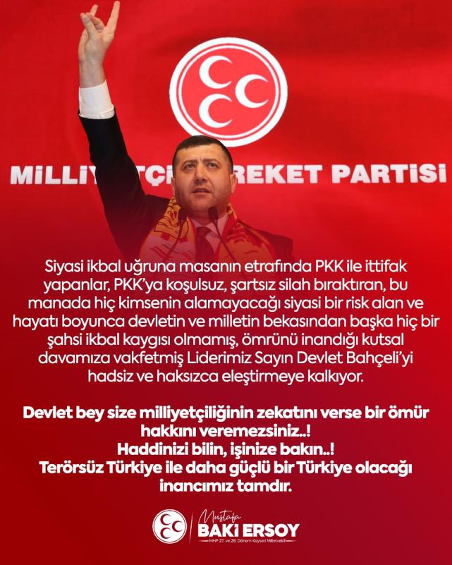 “Siyasi ikbal uğruna masanın etrafında PKK ile ittifak yapanlar, PKK’ya koşulsuz, şartsız silah bıraktıran, bu manada hiç kimsenin alamayacağı siyasi bir risk alan ve hayatı boyunca devletin ve milletin bekasından başka hiçbir şahsi ikbal kaygısı olmamış, ömrünü inandığı kutsal davamıza vakfetmiş Liderimiz Sayın Devlet Bahçeli’yi hadsiz ve haksızca eleştirmeye kalkıyor.”