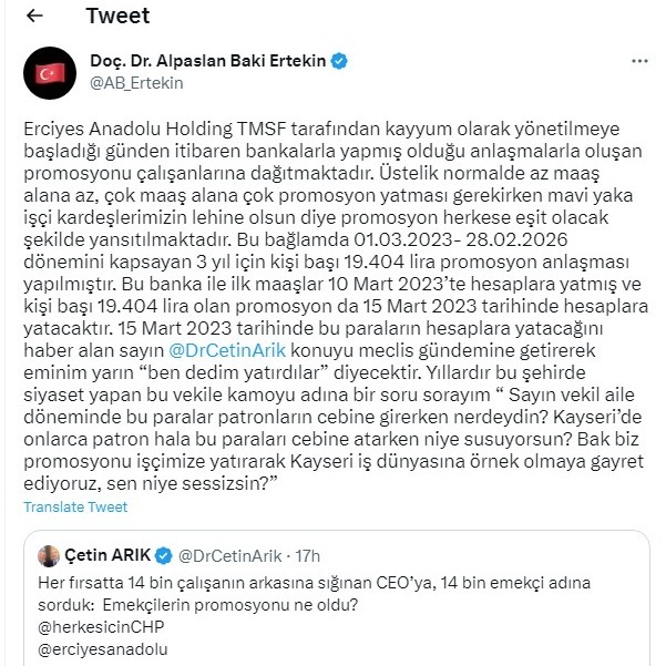CHP Kayseri Milletvekili Çetin Arık, TBMM’de söz alarak Erciyes Anadolu Holding CEO’su Alparslan Baki Ertekin’e yönelttiği, “Her fırsatta 14 bin çalışanın arkasına sığınan CEO’ya, 14 bin emekçi adına sorduk: Emekçilerin promosyonu ne oldu?” sorusuyla ikili arasında tartışma başladı. Sosyal medya hesabından cevap veren CEO Ertekin, promosyon anlaşmasının 1 Mart 2023 itibariyle yapıldığını ve işçilere 15 Mart günü ödeneceğini açıkladı.