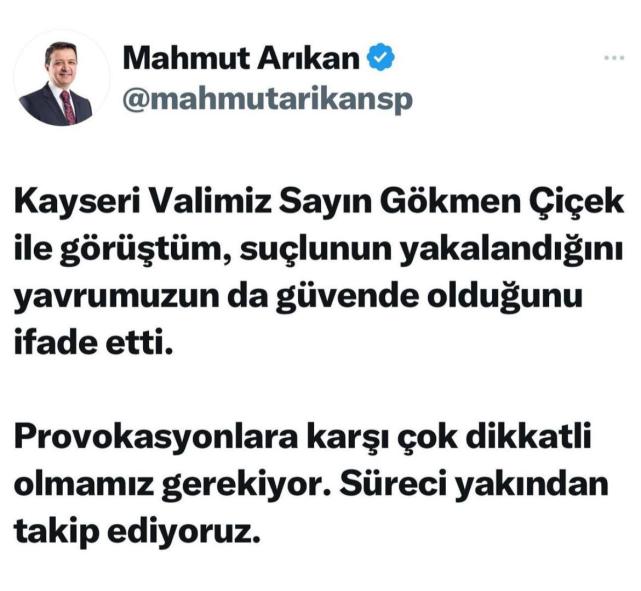 Söz konusu olayla ilgili vatandaşlar ayağa kalktı. Konuya ilişkin sosyal medya üzerinden açıklama yapan Saadet Partisi Kayseri Milletvekili Mahmut Arıkan, “Kayseri Valimiz Sayın Gökmen Çiçek ile görüştüm, suçlunun yakalandığını yavrumuzun da güvende olduğunu ifade etti. Provokasyonlara karşı çok dikkatli olmamız gerekiyor. Süreci yakından takip ediyoruz” ifadelerine yer verdi.