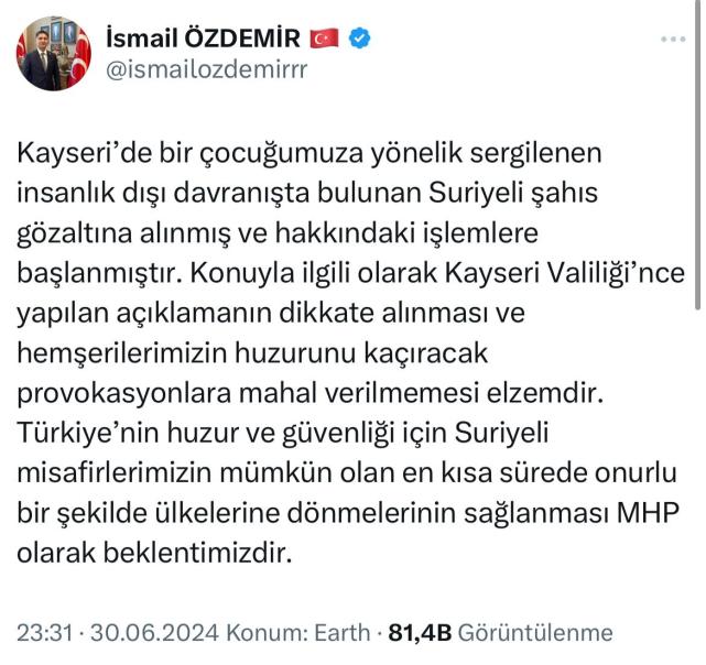 MHP Kayseri Milletvekili İsmail Özdemir Kayseri’de bir çocuğun Suriye uyruklu bir şahsın taciz ettiği iddiasıyla ilgili sosyal medya hesabından açıklama yaparak’ “Kayseri'de bir çocuğumuza yönelik sergilenen insanlık dışı davranışta bulunan Suriyeli şahıs gözaltına alınmış ve hakkındaki işlemlere başlanmıştır. Konuyla ilgili olarak Kayseri Valiliği'nce yapılan açıklamanın dikkate alınması ve hemşerilerimizin huzurunu kaçıracak provokasyonlara mahal verilmemesi elzemdir. Türkiye'nin huzur ve güvenliği için Suriyeli misafirlerimizin mümkün olan en kısa sürede onurlu bir şekilde ülkelerine dönmelerinin sağlanması MHP olarak beklentimizdir” fadelerine yer verdi.