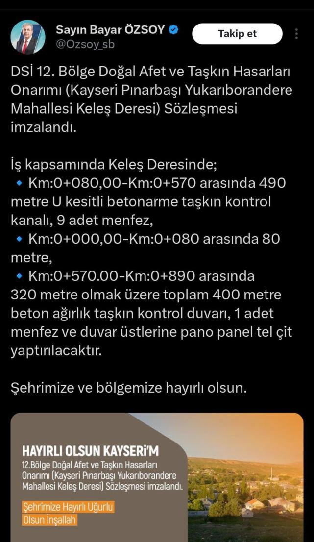 Sözleşme kapsamında yapılacak çalışmalar hakkında sosyal medya hesabı üzerinden bilgiler paylaşan AK Parti Kayseri Milletvekili Sayın Bayar Özsoy, İş kapsamında Keleş Deresinde; Km:0+080,00-Km:0+570 arasında 490 metre U kesitli betonarme taşkın kontrol kanalı, 9 adet menfez, Km:0+000,00-Km:0+080 arasında 80 metre, Km:0+570.00-Km:0+890 arasında 320 metre olmak üzere toplam 400 metre beton ağırlık taşkın kontrol duvarı, bir adet menfez ve duvar üstlerine pano panel tel çit yaptırılacaktır. Şehrimize ve bölgemize hayırlı olsun” ifadelerine yer verdi.