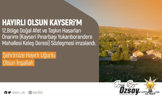 AK Parti Kayseri Milletvekili Bayar Özsoy, sosyal medya hesabından yaptığı paylaşımda Pınarbaşı Keleş Deresi’nde yapılacak olan doğal afet ve taşkın hasarları onarımı için sözleşme imzalandığını duyurdu. Sözleşmeye göre dere için taşkın kontrol kanalları, menfezler, pano paneller ve tel çitler yaptırılacak.