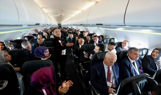Ankara'dan İstanbul'a uçakla seyahat eden 81 il temsilcisi öğretmen, Milli Eğitim Bakanı Yusuf Tekin ile gökyüzünde türküler ve şarkılar eşliğinde Öğretmenler Günü'nü kutladı. Milli Eğitim Bakanlığından yapılan açıklamaya göre, 24 Kasım Öğretmenler Günü kapsamında Cumhurbaşkanı Recep Tayyip Erdoğan'ın ev sahipliğindeki programa katılmak üzere Ankara'dan İstanbul'a seyahat eden 81 il temsilcisi öğretmenler, 30 bin fit yükseklikte kutlama sürpriziyle karşılaştı.Anadolu Jet uçuş ekibi, uçak havalandıktan sonra Bakan Tekin ve beraberindeki öğretmenlere özel anons yaptı.Uçağın kaptan pilotu Gökhan Civelek, "81 ili temsilen gelen öğretmenlerimiz bugün Anadolu Jet uçağımızda bizimle birlikteler. Hoş geldiniz Sayın Bakanımız Yusuf Tekin ve değerli öğretmenlerimiz. Bizleri hayata hazırlayan, bize öğreten ve aile gibi kucaklayan öğretmenlerimize göstermiş olduğunuz sonsuz sabır, inanç ve hoşgörü için teşekkür ederiz. Gösterdiğiniz o inanç, bugünkü başarılarımızda bizler için en büyük motivasyon kaynağımız olmuştur. 24 Kasım Öğretmenler Günü'nüz kutlu olsun." ifadelerini kullandı.Uçaktaki öğretmenler, anonsun ardından Gaziantep temsilcisi müzik öğretmeni Ceylan Balcı'nın seslendirdiği "Mektebin Bacaları" ve "Yeşil Ördek" türkülerine eşlik ederek tempo tuttu. Yolculuk sırasında "Öğretmen Marşı" da seslendirildi.Bugün akşam saatlerinde İstanbul Kongre Merkezi'nde Cumhurbaşkanı Erdoğan tarafından kabul edilecek öğretmenler, bugün ve yarın İstanbul'da Topkapı Sarayı Müzesi, Ayasofya-i Kebir Cami-i Şerifi, Sultanahmet Meydanı, İslam Bilim ve Teknoloji Tarihi Müzesi gibi tarihi, kültürel ve doğal alanları da ziyaret edecek.