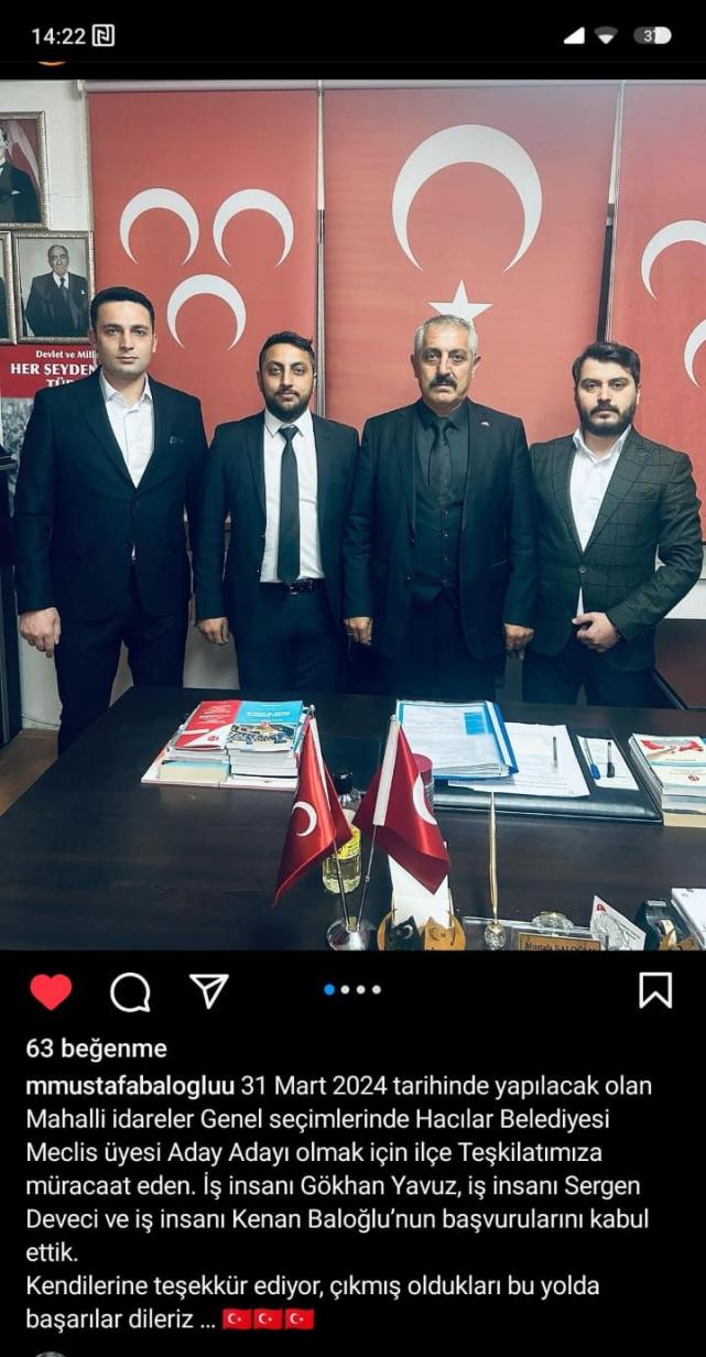 MHP Hacılar İlçe Başkanı Mustafa Baloğlu, sosyal medya hesapları üzerinden yaptığı paylaşımla aday adayı başvurularına ilginin arttığını söyledi.Mahalli İdareler Seçim sürecinin başlamasının ardından aday adayı başvurusu aldıklarını ifade eden Başkan Baloğlu, paylaşımında şu ifadelere yer verdi: "Aday adayları öncelikle Genel Merkezi ziyaret ederek başvurusu yapıyorlardı. Orada oluşan yoğunlukla beraber Kayseri İl Başkanlığı ve İlçe başkanlımızda da aday adayları başvuruları almaya gayret ediyoruz. Partimize şuan yoğun ilgi var.''