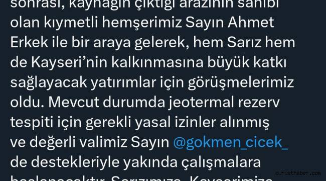 Kahramanmaraş merkezli 7.7 ve 7.6 büyüklüğündeki depremlerin ardından Kayseri'nin Sarız ilçesine bağlı Kızılpınar mahallesinde yer altında sıcak su kaynağı tespit edilmişti. Yapılan ölçümler sonrası 86.1 derece çıkan suyun sıcaklığının hiç düşmediği belirtilmişti. Bunun üzerine Milliyetçi Hareket Partisi Genel Başkan Yardımcısı ve Kayseri Milletvekili İsmail Özdemir, sıcak su rezervinin ilçe ve Kayseri'nin kalkınmasına katkı sağlayacağını ifade ederek müjdeyi verdi. Özdemir, jeotermal rezerv tespiti için izinler alınarak yatırım çalışmalarına başlanacağını belirterek; "Sarız'da çıkan ve jeotermal rezerv olduğuna dair güçlü bulgular sunan sıcak su tespiti sonrası, kaynağın çıktığı arazinin sahibi olan kıymetli hemşerimiz Sayın Ahmet Erkek ile bir araya gelerek, hem Sarız hem de Kayseri'nin kalkınmasına büyük katkı sağlayacak yatırımlar için görüşmelerimiz oldu. Mevcut durumda jeotermal rezerv tespiti için gerekli yasal izinler alınmış ve değerli valimiz Sayın Gökmen Çiçek’in de destekleriyle yakında çalışmalara başlanacaktır. Sarızımıza, Kayserimize hayırlı uğurlu olsun. İnşallah yakın gelecekte Sarız'da termal otellerin ve seracılık faaliyetlerinin yürütüldüğü günlere hep birlikte kavuşacağız" dedi.