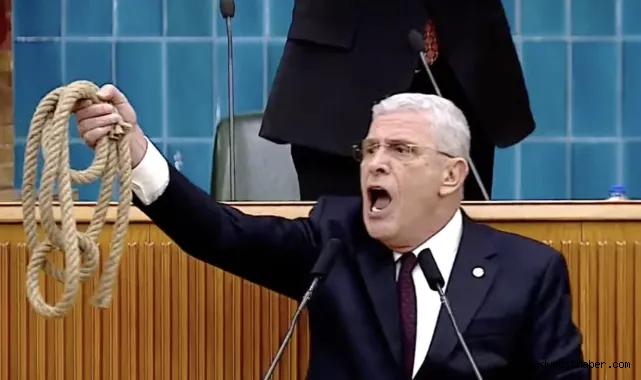 İyi Parti'nin TBMM'deki grup toplantısında Genel Başkan Müsavat Dervişoğlu, eline aldığı urganı sallayıp, "Bu büyük milletin anılarını yok ettiniz. Bu büyük milletin geleceğini katlettiniz. Al şimdi bu ipi baş köşede başının ucuna as" ifadelerini kullandı.