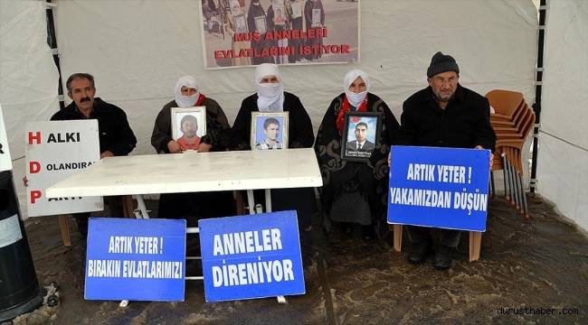 HDP İl Başkanlığı binası önünde bir araya gelen aileler, "Halk düşmanı parti", "Evlatlarımızı vereceksiniz", "Ha HDP ha PKK", "Türk-Kürt kardeştir, HDP kalleştir", "Halkı dolandıran parti", "Anneler direniyor", "Artık yeter yakamızdan düşün" ve "Yeter artık evlatlarımızı bırakın" yazılı pankartlar açtı.Çocuklarının fotoğraflarıyla eyleme katılan anne ve babalar, evlatlarına "teslim ol" çağrısında bulundu.Baba Halit Altun, gazetecilere yaptığı açıklamada, yıllardır çocuğuna kavuşacağı günü beklediğini söyledi.Sekiz yıldır çocuğundan haber alamadığını belirten Altun, "Yıllardır evlat acısı çekiyoruz, inşallah onlar da aynı acıyı çekerler. Kar, kış, soğuk hava demeden burada evlatlarımızın peşindeyiz. Kimse bizi düşünmüyor. Tek isteğimiz çocuklarımızı bırakmaları. Çocuklarımıza kavuşana kadar eylemi sürdüreceğiz." diye konuştu.Çocuğuna teslim olması için çağrıda bulunan Ayten Koçhan da "Oğlum eğer beni duyuyorsan artık dön. Gel anne, babana hizmet et. Kar, kış demeden burada eylemimizi yapıyoruz. Yolunuz yol değil, dönün, devletinize teslim olun." ifadelerini kullandı.