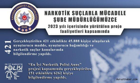 Kayseri’de narkotik ekipleri 2023 yılı içerisinde gerçekleştirdikleri 421 etkinlik kapsamında 45 bin 888 kişiye ulaştı. Ekipler uyuşturucu madde, uyuşturucu bağımlılığı ve narkotik suçlar konusunda vatandaşlara bilgilendirme yaptı.