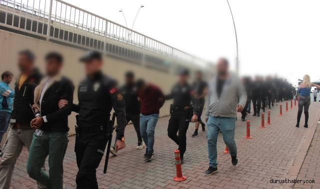 Bugün sabah saatlerinde 25 hedef şahsa yönelik, 21 adrese toplamda 67 ekip 234 personelle eş zamanlı sonlandırma operasyon kapsamında da; 1 adet launcher patlayıcı mühimmat, 5 adet ruhsatsız silah, 1 adet tüfek, 39 adet fişek, 12 parça 25 gram metamfetamin ve 2 gram sentetik kannabinoid maddesi ele geçirildi. 24 kişi, ‘Uyuşturucu madde ticareti yapmak’ suçundan gözaltına alındı.Şüpheliler sağlık kontrolünden geçirilmesinin ardından adliyeye sevk edildi.Öte yandan şüphelilerden biri, kendisini görüntüleyen basın mensuplarına da ayakkabı fırlatarak tepki gösterdi.