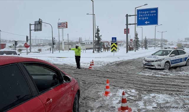 Kent çıkışında yolu kapatarak sürücüleri Niğde yoluna yönlendiren polis ekipleri, anons yaparak sürücüleri uyardı.Hava sıcaklığının sıfırın altında 3 dereceye kadar düştüğü bölgede uzun araç kuyrukları oluştu.