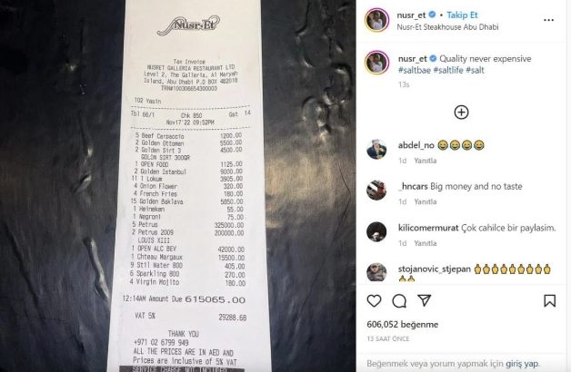 Dünyanın birçok bölgesinde restoranları bulunun Nusret Gökçe medyada sıkça adından söz ettirmeye devam ediyor.Tuz serpme hareketiyle tanınan Gökçe’nin dünya çapında 32 yerde restoranı bulunuyor. Mekanlarında paylaşılan yüksek oranlardaki hesaplar medyada yankı uyandırmaya devam ediyor.Ünlü isim bu sefer kendisi mekanlarındaki bir hesap fişini yayınladı.Hesap 3 milyon TL…Kendine özgü tarzıyla kısa sürede ünlenen ve sosyal medyada 49 milyon takipçiye ulaşmış durumda. Sosyal medya hesabını oldukça aktif şekilde kullanan Nusret Gökçe, Abu Dhabi’daki restoranında ödenen hesap fişini paylaştı.“Kalite asla pahalı değildir” notuyla paylaştığı fişin tutarı 615.000 Dinar, Türk parasıyla ise tamı tamına 3.1 milyon TL yapıyor.