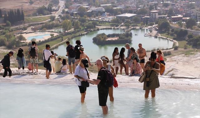 UNESCO Dünya Mirası Listesi'ndeki ören yerinde geçen yılın ocak-ekim döneminde 1 milyon 774 bin 871 kişiye ulaşan ziyaretçi sayısı, bu yılın aynı döneminde 2 milyon 36 bin 272 olarak kayıtlara geçti. Bölgede ara tatil döneminde ziyaretçi yoğunluğunun daha da artması bekleniyor. Oteller, şimdiden tam kapasiteye yakın çalışıyor.Türkiye Otelciler Federasyonu (TÜROFED) Başkan Yardımcısı Gazi Murat Şen, AA muhabirine, ilk ara tatilin başlayacak olması nedeniyle bölgedeki otellerde rezervasyon doluluk oranının yüzde 100'e yaklaştığını belirtti. Kültür ve Turizm Bakanı Mehmet Nuri Ersoy'un önceki günkü Denizli ziyaretinde Pamukkale için verdiği müjdelerin çok önemli olduğunu dile getiren Şen, uzun süredir bekledikleri gece müzeciliğinin artık yakında başlayacağını ifade etti.Şen, Pamukkale'deki kazıların 12 aya çıkartılmasının bölgeye ilgiyi daha da artıracağına işaret ederek, "Bu yılın ilk 10 ayına baktığımız zaman 2 milyon kişiyi geçtik ziyaretçi olarak. Yıl sonu itibarıyla yaklaşık 2 milyon 400 bin kişinin Pamukkale Hierapolis Ören Yeri'ni ziyaret ettiğini göreceğiz." diye konuştu. Ara tatilde misafirleri ağırlamak için aylar öncesinden başladıkları hazırlıkların tamamlandığını belirten Şen şöyle devam etti:"Öğrencilerimizin, velilerin yoğun şekilde Pamukkale'ye ilgisi var. Özellikle sonbahar aylarında ziyaretçiler termal bölgeleri çok talep ediyor. Bu anlamda da Pamukkale'deki doluluklar şu anda yüzde 100'e yakın seyretmekte. Biz tüm yerli ve yabancı ziyaretçilerimizi Pamukkale'ye davet ediyoruz.""400 bin civarında Çinli ziyaretçi bekliyoruz"Şen, turizmciler olarak 2024 yılı beklentilerinin oldukça yüksek olduğuna dikkati çekerek şunları kaydetti:"Özellikle Çin pazarı Pamukkale için çok önemli. Pamukkale'ye Çin pazarının da açılmasıyla biz ekstra 400 bin civarında Çinli ziyaretçi bekliyoruz. Bunun yanında Karahayıt Mahallesi'nde açılan fizik tedavi rehabilitasyon hastanesi de özellikle sağlık turizmi için Pamukkale bölgesini çok cazip hale getirecektir. Bunlarla beraber biz 3 milyon hedefimizi koyuyoruz. Umarım 2024 yılında bu hedefe ulaşacağız." Muhabir: Sebahatdin Zeyrek