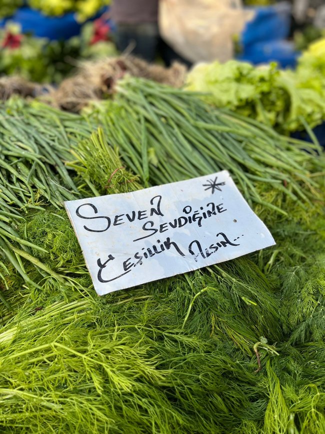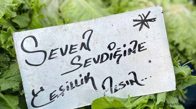 Maydonoz, marul, yeşil soğan gibi yeşillik ürünleri satan esnaf ‘seven sevdiğine yeşillik alsın’ yazılı pankartı tezgahına koydu. Vatandaşlar ise esprili yazıya gülerek tezgahtan alışveriş yaptılar.